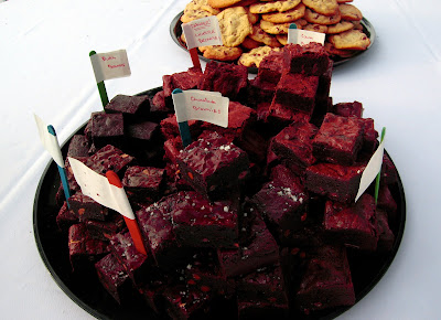 As with other pig roast photos, please excuse the pictures. The brownies turned out kinda red in them–I am not sure why, maybe that setting sun streaming into the picture. But I think you can get the idea of the tray nonetheless; I got loads of compliments on them.