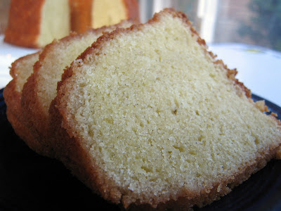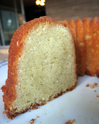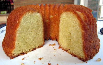 I have had such luck with my Nordic Ware bundt pans that I think the fault is mine for even attempting this cake in a bundt pan. In my defense, I have had other recipes which called for parchment paper in tube pans come out fine in a bundt sans parchment paper, but this time some of it stuck. Not too badly as you can see, it looks rather moth eaten (nice thought, huh?), rather than broken in half or anything, and frankly it was so good (and just for us here at home) that I really didn’t care. But I guess you should make it in a tube pan, the bottom lined with parchment paper, as instructed, rather than a bundt pan.