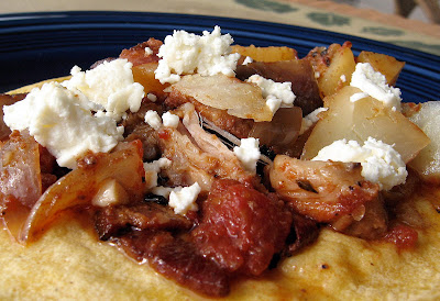 When you are ready to serve, place 2 layered tortillas on a plate. Put a few pieces of pork and potato on the taco, as well as some of the onion/tomato mixture. Ladle a small amount of the sauce over it as well as some bacon bits. Crumble the queso fresco over the pork as well as diced avocado if using. Roll and eat. You should probably aim to not overload your taco as much as I have a tendency of doing.
