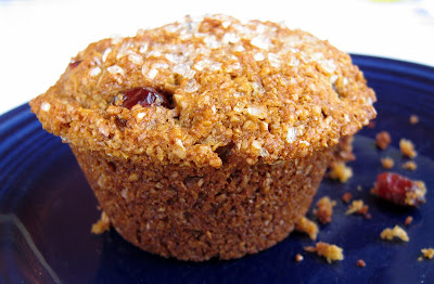 I went searching and finally settled on the 100% whole grain bran muffins made by Farmgirl Susan over at Farmgirl Fare. For one thing, they also used oat bran, and I vastly prefer oats to wheat. I also liked that they had 2/3 cup total of sweeteners–I definitely prefer sweet quick breads. I used dried cranberries and some orange extract and some orange oil. If I had had any oranges around I would have subbed some orange juice in for some of the milk and used orange zest as well. In my experience a little orange zest or oil goes a long way (as opposed to lemon, where more is better) so while I did not use enough (thanks to not being able to smell a thing) I would still be careful while experimenting to not use too much. Maybe the zest of one orange or 1/4 teaspoon of oil. And one teaspoon extract if you are not using any juice–otherwise it is not necessary.