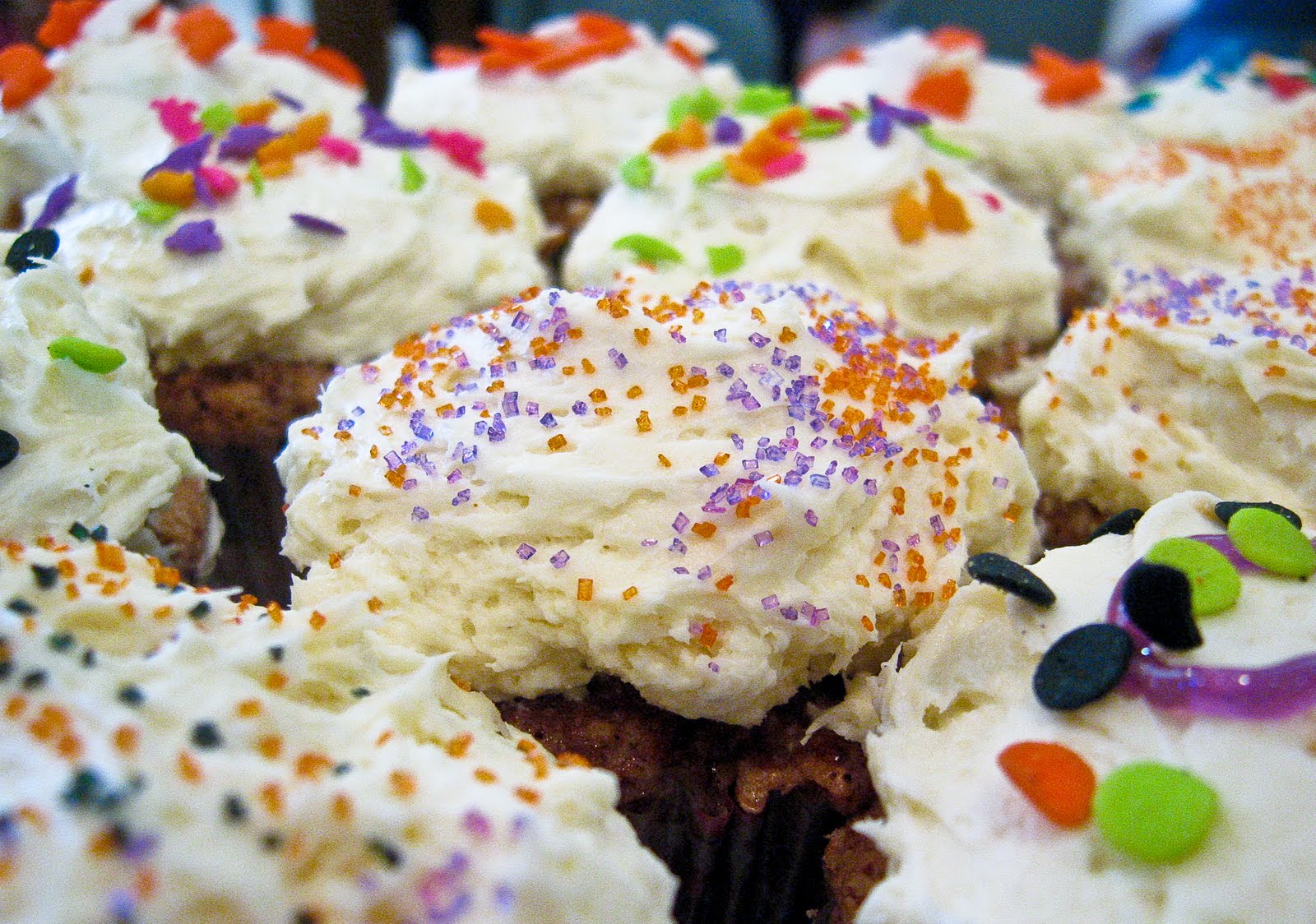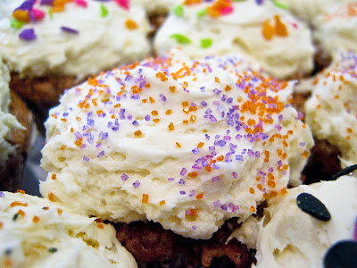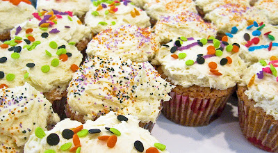 Sammy requested carrot cupcakes–I am not sure where she got the notion, but she became obsessed with it. Which was nice, because I used to feel guilty for foisting more autumnal desserts on her when Alex got chocolate and/or lemon in June. Sprinkles are a Shaky Handed Mom’s dream come true, because every kid loves them and you don’t need steady decorating hands to use them. (My niece’s birthday is also in the fall and we just went to her party, where her mom had made a beautiful pink princess cake–someday I am going to get her to come and decorate my kids’ cakes!) With Halloween just around the corner, we went for Halloween colored sprinkles–but you might also see dinosaurs and football helmets mixed in there.
