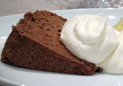 I thought I had settled on a chocolate angel food cake recipe, but then I was at a party where the hostess had baked Rose Levy Beranbaum’s chocolate angel food cake. I was completely and totally hooked. It was perfect. It is moist and really chocolatey–and yet, like I said, light, ethereal. For once, no one said “Oh this is so rich I cannot finish it”–instead their plates had nary a crumb.