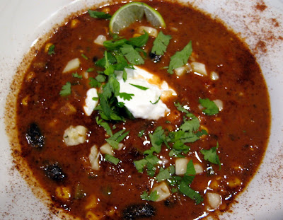 In the meantime, add the sweet bell pepper to the cooking veggies. After about 3 minutes, add the chile-tomato puree back into the soup pot. “Rinse” the blender out with the chicken stock and add this to the pot as well. Bring to a boil. Add the beans, ladled in with broth but do not add all of the broth, rather just what comes in with the beans, and add the frozen corn. Return to a boil.
