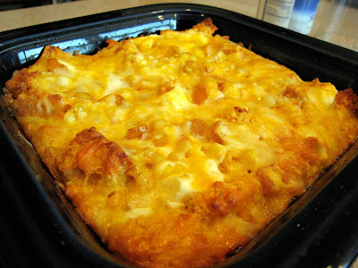 Whisk together the eggs, cream and milk, and hot sauce. Pour it over the baking dish, soaking the top evenly (i.e., do not leave parts dry). You can do up to this point overnight but I did not.