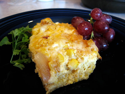 The following recipe was originally for a full pan of the Dairy Hollow House Skillet Cornbread, but of course I had a little less than a half pan, so I accordingly scaled it back. It also called for roasted chopped green chile peppers, but I still had the corn relish from the Sopa Tarasca, so I used it instead.