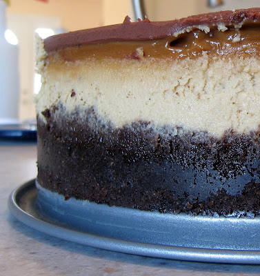 When I think cheesecake the flavors that come to mind are: vanilla, chocolate, coffee and lemon. The lemon clearly does not work with the others–at least for me–and I had just made that goat cheese lemon cheesecake, so I nixed lemon. I also nixed vanilla because to really hi-light vanilla it needs to be the only flavor (as opposed to using a bit of extract) and I thought that was too boring for this assignment. That left coffee and chocolate. My husband does not like a really strong coffee flavor (my loss and one of his few flaws as my usually appreciative audience), so after thinking about what I could do to tame it and remembering how much I loved Turtle Cheesecake when I was a kid, I decided to try adding some sort of caramel to the mix. I had some imported Argentinean dulce de leche in my pantry (yes I made this challenge entirely from the pantry as well!) and decided to use it. I also found some chocolate graham crackers for the crust, Sharffenberger chocolate and cream for a ganache layer, and I made up my mind to do layers with the dulce de leche and ganache. In retrospect, I think the ganache had a little too much cream as it was a bit soft. Next time I would use less. But this was just a cosmetic criticism–from a flavor perspective this cheesecake was a winner.