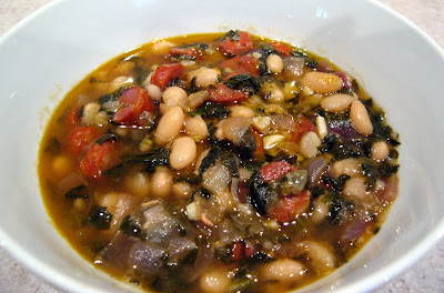 So I decided to get over my hesitant inexperience and just go for it. I found some dried Great Northern (white) beans that needed to be used up and started cooking those with garlic and some good quality extra virgin olive oil. I have my sister to thank for that last ingredient–when she was off seeing U2 (cough, sputter, cough) in Spain without me, she also had the probably guilt induced thought to pick me up a can of good Spanish olive oil. (Kidding!–I am sure she would have brought it for me either way). So into the beans that went.