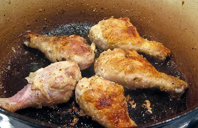 - Heat 2 tablespoons of olive oil over medium high heat in a medium-large Dutch oven (5-7 qt). Brown the chicken in batches, slowly, making the the skin getting nicely browned. Remove and set aside. Add a little more oil if necessary, reduce the heat to medium and brown the mushrooms with a pinch of salt. This will take 15 minutes or so. Remove the mushrooms as well to the bowl with the chicken.