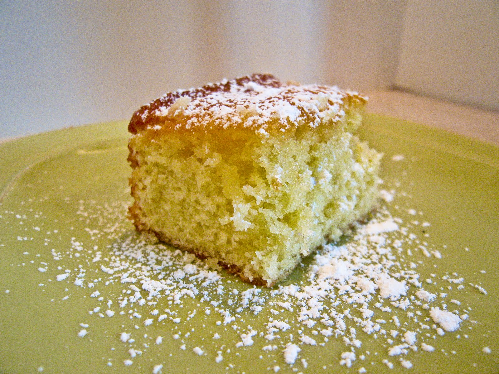 Let the cake cool in its pan for 10 minutes and then remove it from the pan, removing the parchment paper from the bottom and flipping it back over to cool right side up. Place it on a cooling rack that has foil underneath it. Poke many small holes in the top of the cake with a skewer or toothpick. Brush the glaze over the cake–it will absorb and then you will brush again and again, until the syrup is used up. If you want you can also use the syrup that drips down to the foil but I did not bother. Let the cake cool and sprinkle with confectioner’s sugar before serving.