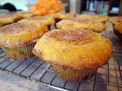 Whisk together the flour, baking powder, baking soda and salt. Mixing gently, add the flour mixture to the batter in 3 additions, alternating with 2 additions of the sour cream, beginning and ending with the flour mixture. Line a muffin pan with muffin liners. Briefly spray the pan and muffin liners with nonstick spray. Scoop 1/3 cup of batter into each muffin liner. Sprinkle the tops with cinnamon sugar. Bake for 14-17 minutes, or until a toothpick inserted into the center of a muffin comes out clean. Mine took longer since I made them too big. Also because they came out too big, I sprinkled them with additional cinnamon sugar (the sides that had none) when they came out of the oven. Let the muffins cool for 5 minutes in the pan and then gently knock them out onto a cooling rack. Cool right side up.