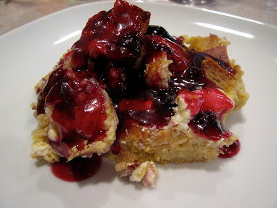 - Lightly butter a 9X12 casserole dish. Place half of the bread cubes into the bottom of the pan. Sprinkle the blueberries over these, along with the cubed cream cheese. Then sprinkle the other half of the cubed bread.