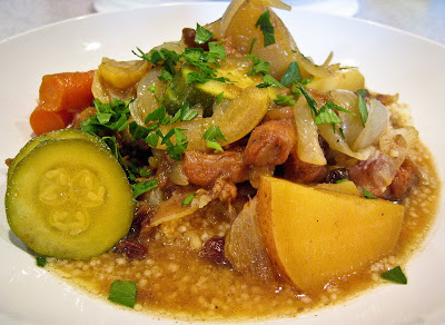In the meantime, prep your carrots and zucchini (I like my carrots firm–if you like them softer add them with the potatoes). After the hour is up, add the lemon wedges, zucchini and carrots to the pot with the dried fruit. Turn the heat up to 300 F. Cook for another hour and then serve with couscous. Remove the lemon wedges if desired (I leave them in and just avoid them) and squirt with the fresh juice from a half lemon. Taste for additional seasoning, especially salt. Sprinkle with parsley before serving.