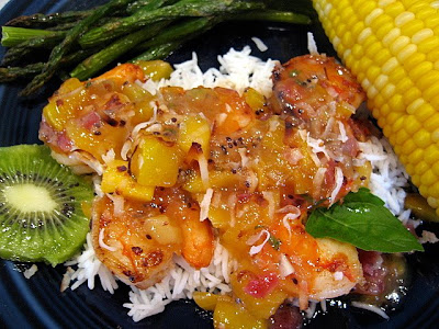 First, I can also serve it with seared scallops. Second, it has a sweet, fruity “sauce” on it, which Alex should like–and I can keep the shrimp separate from the salsa, which is nice for me. Third, the tropical flavors keep it interesting and different from everyday–good for a birthday party.