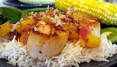 OK, I linked to the recipe above; here are my changes: I seared the scallops in an oil/butter mixture and then sauteed the shrimp after that was finished (thus preserving the shrimp-free flavor of the scallops, haha). The shrimp turned out beautifully, and so easy. John devoured it. And look at the crust on the scallops–I definitely prefer sea scallops to bay scallops and that is why. Next change: I cooked the Warm Tropical Fruit Salsa in a separate pot. I began by sauteing the onion with 2 cloves garlic. After adding the mango and kiwi, I also added guava jam and some hot pepper jelly–mild homemade jelly by Josie for the kids and stinkin’ hot habanero jelly in addition to that for me and John. I served with a small amount of basmati rice to soak up the sauce and sliced kiwi and mint leaves for garnish.