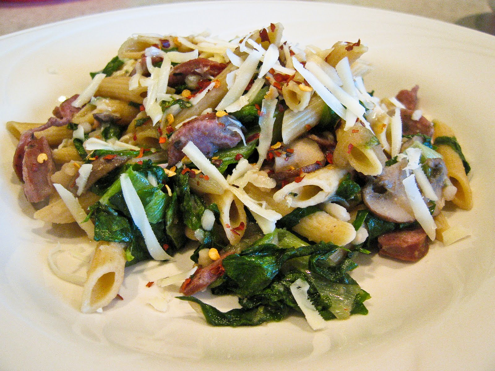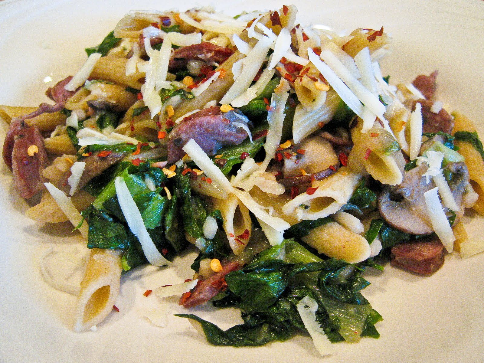 Penne with Crimini Mushrooms, Sausage, White Beans & Escarole
