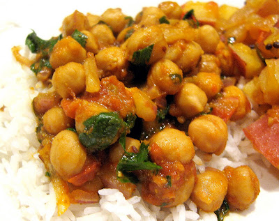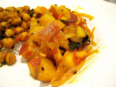 I have discovered that, second to Mexican/Latin flavors, Indian flavors are fast becoming one of the things I crave when I am sick. Hearty, warming, homey, soul food. No doubt my parents are staring at this in some confusion wondering how Indian food has come to be comfort food for me since I had never even tried Indian food until after college. My family, escept my sister, has a strong aversion to Indian food, so of course I waited until my mom had left, but then the first thing I made for us was this dish of chickpeas on rice with potatoes. A little starchy, yes, but I crave starch when sick AND I started with the potato dish, but everything else I looked at and felt up to making seemed to need rice served with it. So 2 starches it was.