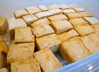 This picture was taken about a week after I made the marshmallows, which is why the tops are a little dried out and cracked. But they still tasted plenty yummy.One note about the gelatin: when I was typing this recipe out, I realized that I made it (twice no less) with less gelatin than she calls for. The recipe still came out, both times. I made it with 3 tablespoons of gelatin and she calls for 4 tablespoons. Make of this what you will.