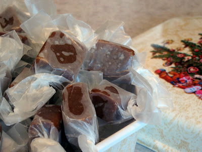 - Sprinkle the sea salt over the top of the caramel and then use clean hands to press the salt lightly into the caramel so that it sticks and does not brush off. Remove the caramel, using the foil overhang, from the pan. Press a square of parchment paper lightly into the top of the caramel and then invert it. Slowly and carefully peel the foil away from the caramel. Sprinkle sea salt onto the back side as well, pressing it once again lightly into the caramel. Use an oiled knife to slice a 9 by 9 grid--i.e., you will get 81 1-inch caramels. Wrap each one into cellophane or wax paper.