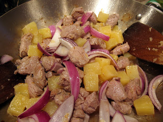 Like many SE Asian stir fries, this dish is simple to prepare, as long as you have everything ready to go before you start stir frying. The second important rule of thumb is that you must carefully choose the order in which you stir fry your vegetables. Some require longer cooking and come require only the barest heat through. What vegetables you use is up to you. For my own taste I consider pineapple to be non-negotiable (and I think canned subs fine). I also love the unexpected crunch of cucumber and explosive burst of grape or cherry tomatoes. I sometimes add broccoli but did not tonight. While certain rules are obvious, don’t let anyone’s “rules” dictate how cooked you want your veggies. For example, a Thai cook would add the onions late, but I always add them early because I do not believe home stoves get hot enough to cook the onions enough and raw onions bug my stomach.