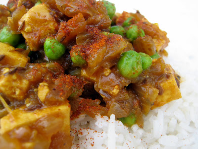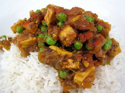 My only change was to add peas and sprinkle salt on the onions while cooking to release their water. I used one super huge heirloom tomato and then supplemented with 2 quite small zebra tomatoes, all from my garden (wish I had taken their pictures now). The zebra tomatoes account for the less red nature of the curry, since they are yellow/green when ripe. I did not peel but instead just processed the tomatoes with my immersion blender in its jar. My onions were medium to big. As always, I used a paprika chili powder to eliminate heat issues for my kids and served with cayenne pepper for John.