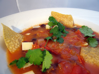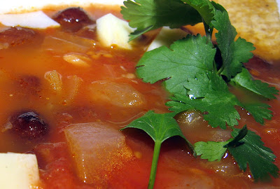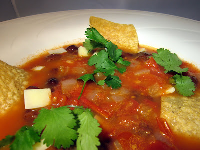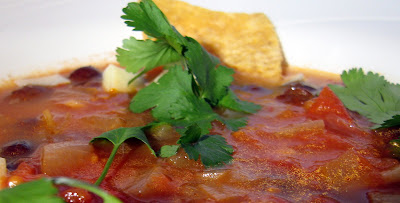 Serve, ladled into bowls, over the various garnishes (except cilantro and tortilla chips, which should go on top).