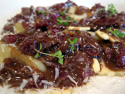 In a large, heavy skillet, heat the olive oil. Add the butter. When it is is sizzling and mostly melted, add the garlic. Cook for 30-60 seconds to infused to fat with garlic. Then add the onion and saute until turning light golden brown and toasting in spots. Sprinkle the onion with some salt. Splash the 2 tablespoons (eyeball it) of balsamic vinegar into the pan to de-glaze the it. After it cooks away, add the cream and remaining balsamic vinegar and chopped thyme. Simmer briskly, stirring, for one minute. Serve, drizzled over the mushroom ravioli.
